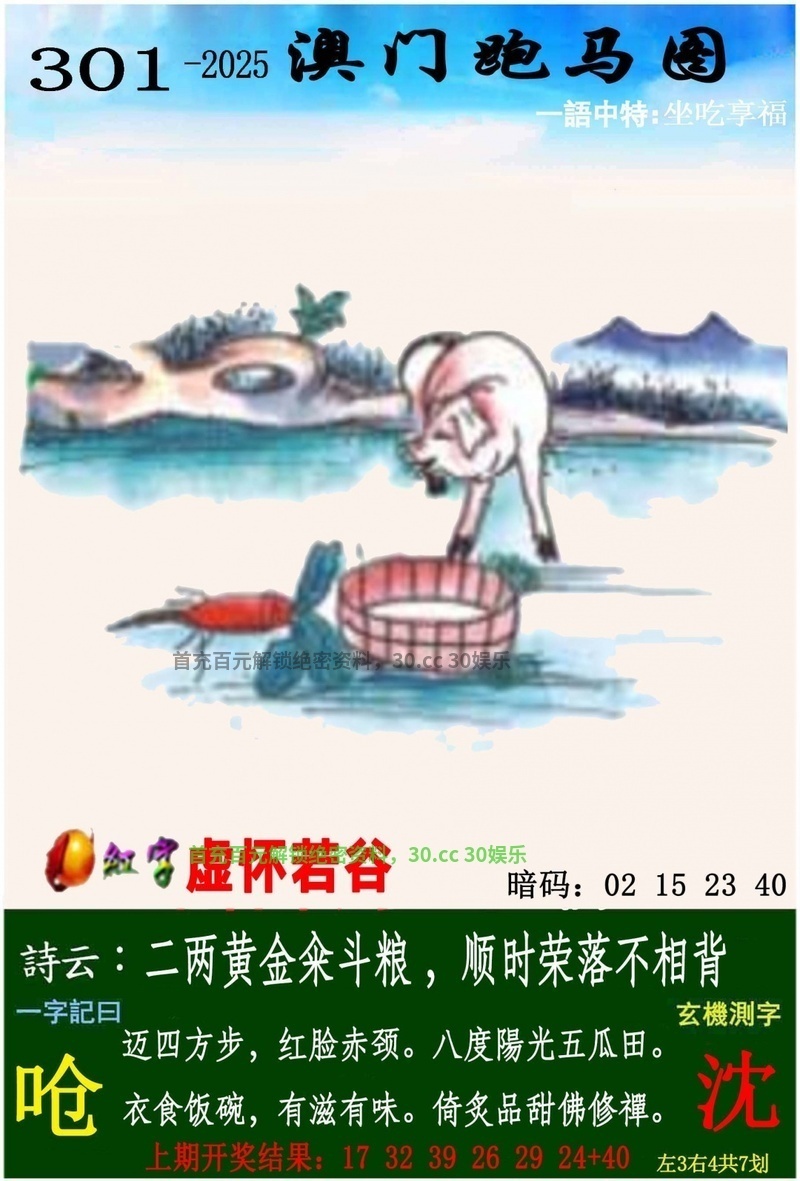 | 304期:一字記曰: 生拉活扯,召之即来,打井有序勤添富 左右摇摆,不可抗拒,挑擔無側踏坦途 |